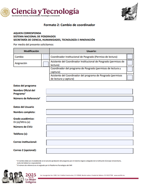 Para realizar el proceso de cambio de coordinadores ante SECIHTI, se debe llenar el formato No. 2 de la Secretaría ya mencionada, el cual deberá tener los datos siguientes: